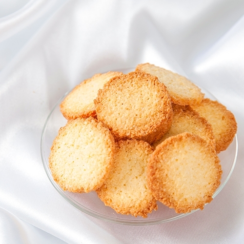 3.輕甜爽脆的絕妙口感,師傅手工一個個將椰絲平均攤平在麵糊上,且厚度必須一致,才能烤出餅乾的酥脆口感