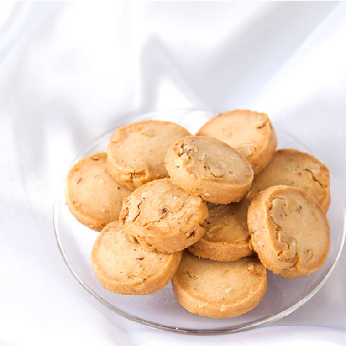 1.核桃酥片嚴選生鮮核桃,進行長時間低溫烤焙,再揉入麵團中製作餅乾